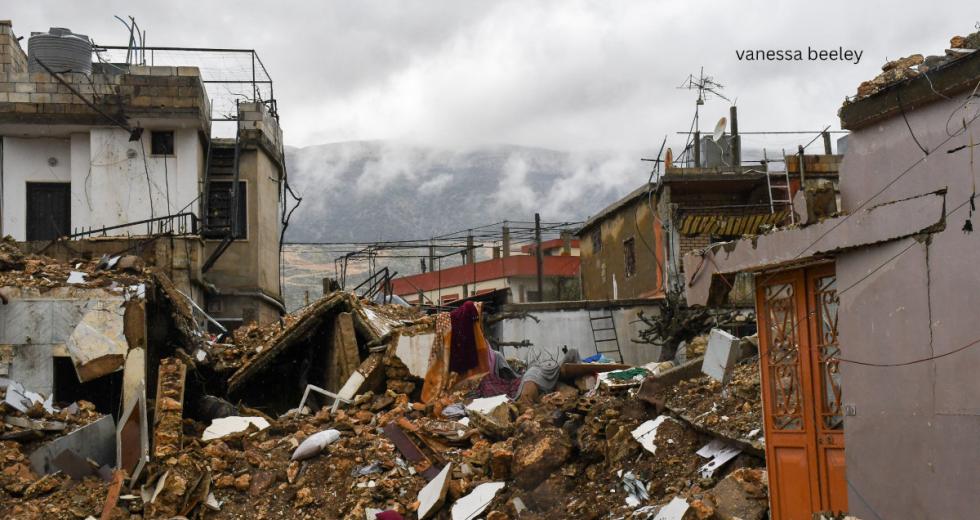 The young men escorting us led us through the narrow streets to the next area of devastation in the town. We passed a house, a red velvet chair still on the balcony next to the familiar posters of martyrs from the town, young men who had been fighting in the 2024 war in various regions of Lebanon, defending their homeland against the Zionist aggression.